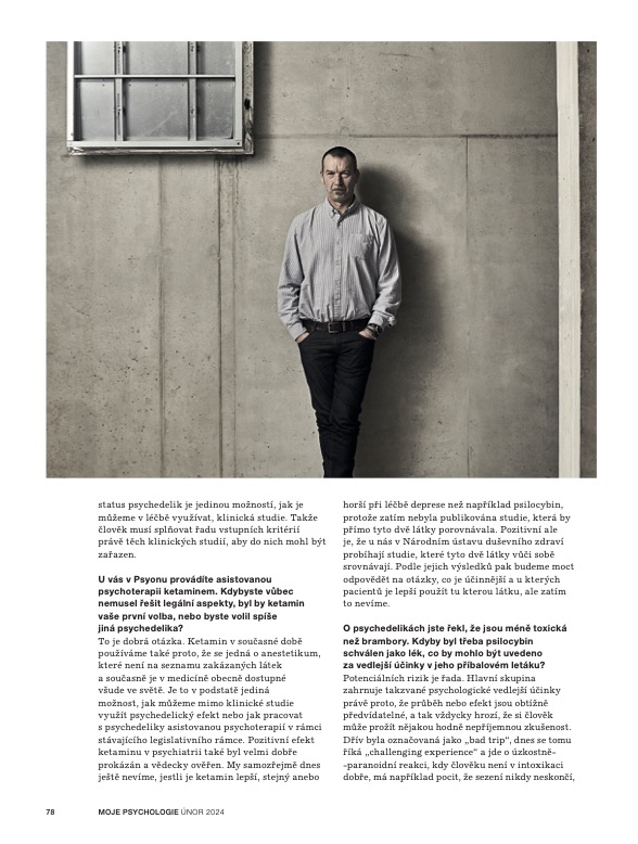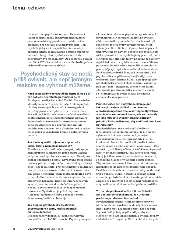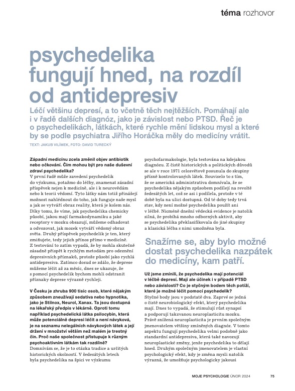 Zdroj: Moje psychologie 02/2024 (text: Jakub Vilímek, Psychedelika fungují hned, na rozdíl od antidepresiv); Foto: David Turecký