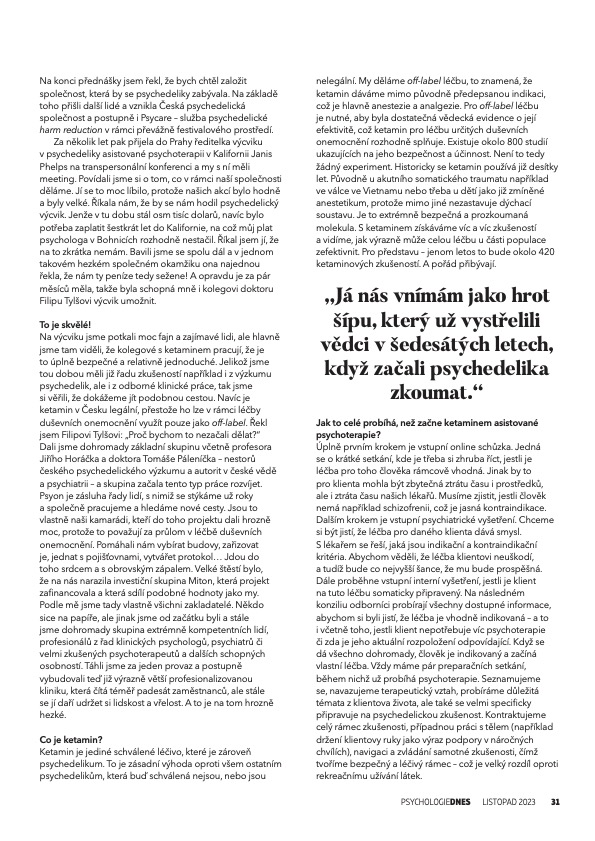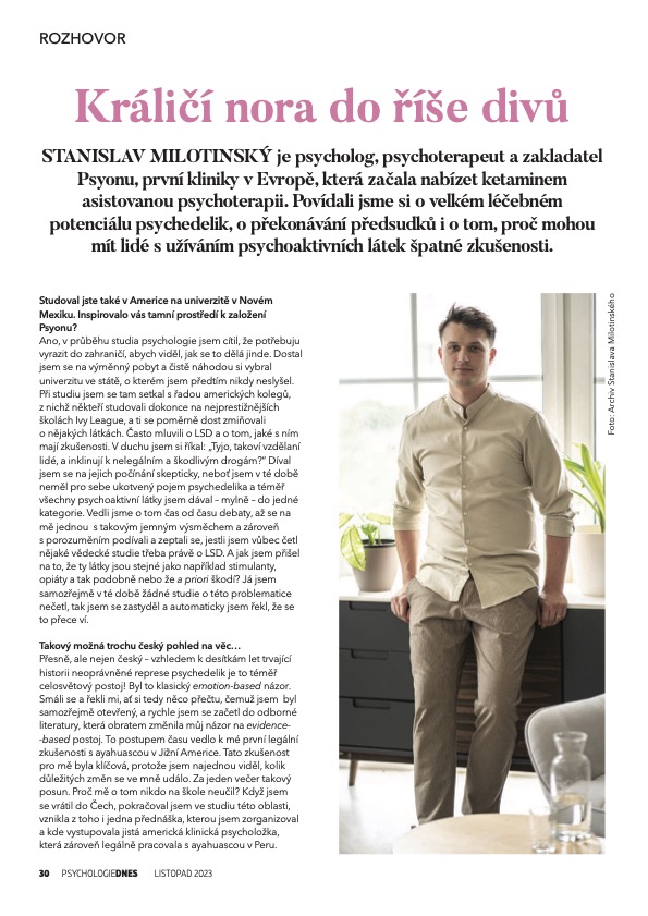 Tématem listopadového čísla časopisu Psychologie dnes jsou z velké části psychedelika a jejich význam v péči o duševní zdraví. Velmi nás těší, že v čísle najdete také obsáhlý rozhovor se Stanislavem Milotinským, psychologem, psychoterapeutem a jedním ze zakladatelů Psyonu.